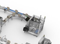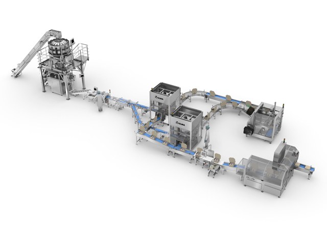 Packaging line for sweets and confectionery that includes automatic bagging and case packing.
