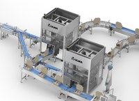 The case packing cells have a delta robot and a bag grouping system. The robot uses a vacuum system to manipulate the groups and fit them into the corresponding boxes. The case packing cells are flexible since they allow working with the different customer references and making different casing tiles.