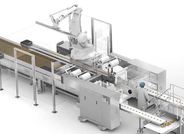 Using an anthropomorphic robot, the muffins coming from the oven are removed and loaded into the infeed conveyor of the flow pack wrapper.