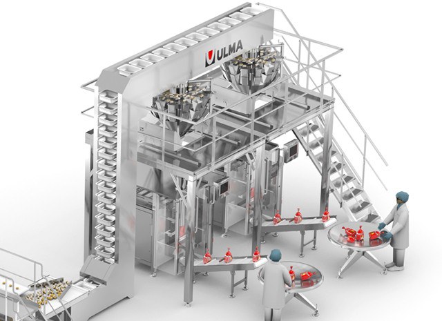 By means of conveyor belts and a bucket elevator, unitary packages are transported to the combination multi-head weighers that carry out the established multipack doses.