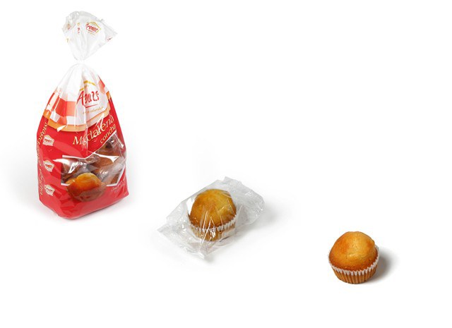 Two flow pack wrappers perform the unitary packaging of each muffin.