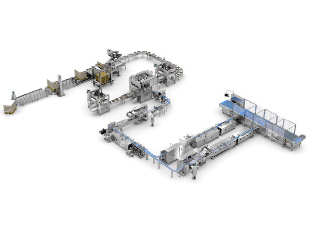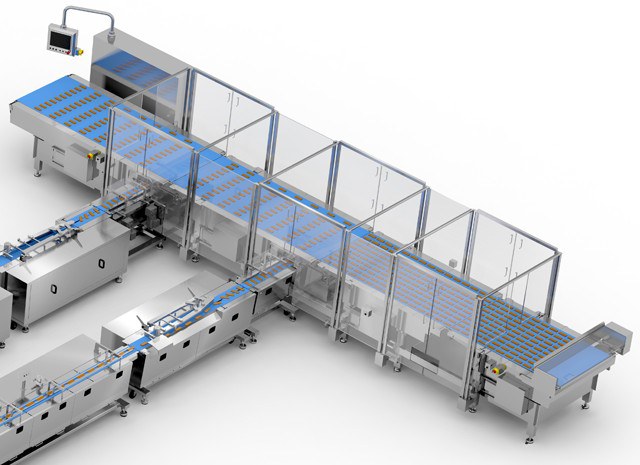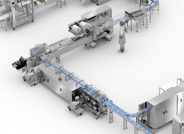 The row distributor system feeds the two primary flow wrapping lines, removing rows of product from the main product belt.