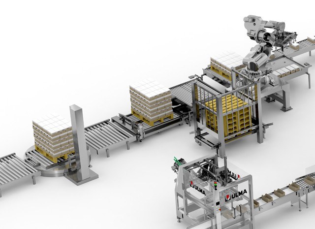 Robotic palletizing is responsible for the realization of pallets of boxes that are finally wrapped with stretch plastic film.