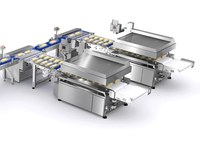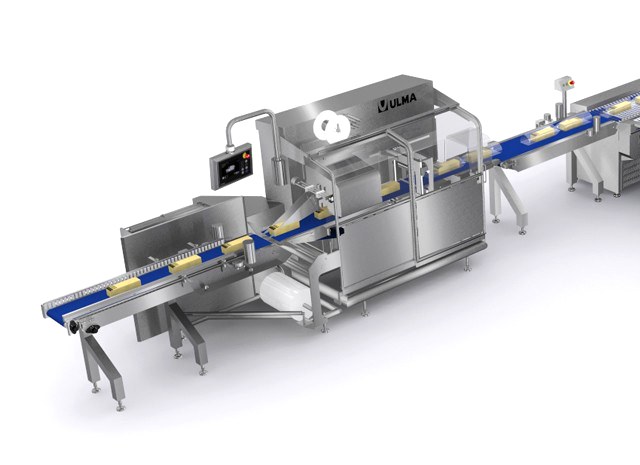 Automatic vacuum packaging solution for cheese bars with double transfer system to vacuum chambers.