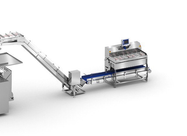 The packing machine has an inclination of 45º to avoid product damage due to the fall by gravity. It performs bags of fish fillets that are received from the elevator belt.