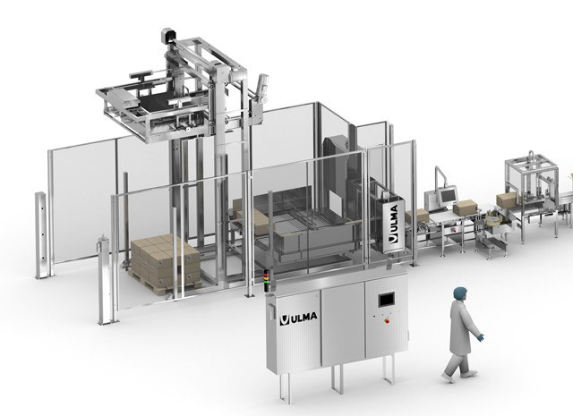 The line consists of case erector for carton boxes, robotized case packing cell and box closing system. All perfectly integrated into the line so that the process is fully automatic.