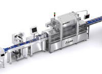 ULMA' s TSA automatic and hygienic design traysealer seals the trays of meat fillets in a controlled atmosphere (MAP) to increase their shelf life. It has an automatic tray denester that feeds the trays to the infeed belt.
