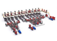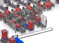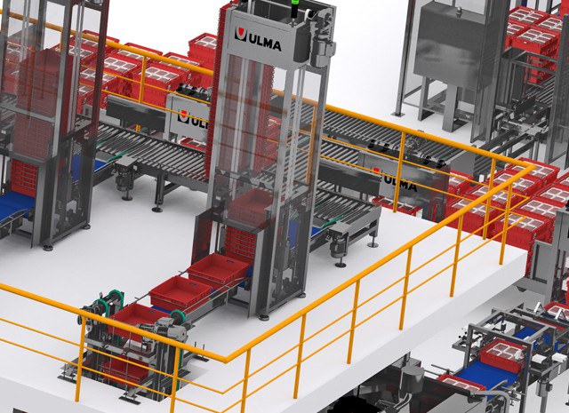 The facility receives complete pallets of plastic crates that are empty and clean. These pallets are depalletized and the crates are transported in columns to the upper floor using a crate column lift.