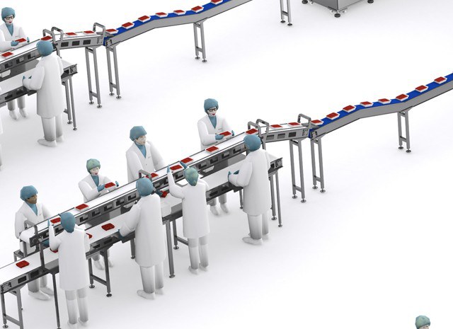 Each production line starts with a work table for manual loading of products into trays. The tables have different transport systems to: receive empty individual trays, collect the product to be placed in them and, finally, transport the filled trays to the traysealing machines.