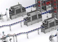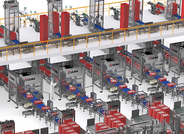 The complete automation solution for the packaging plant includes eleven packaging lines for different meat products. Each line consists of a TSA traysealer and a robotic case packing cell. The palletizing area consists of three palletizing cells palletize all the incoming references from the eleven production lines.