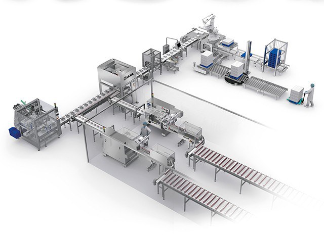 The case packing area is formed by a case erector that provides the carton boxes to the boxing cell.