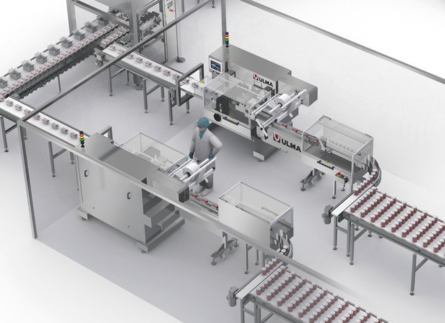 This case packing cell consists of a robot that collects the flow wrapped packages from the two lines and inserts them into the carton boxes.