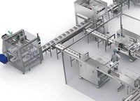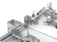 The packaging of the Petri dish stacks is carried out in two flow wrappers whose exit belt supplies the next area of the process.