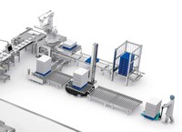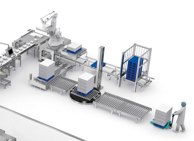 The palletizing cell consists of an anthropoform robot that is responsible for stacking the boxes on the pallets.