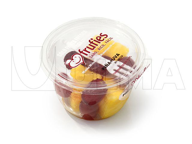 Ready to eat cutted fruit packaging in traysealing with modified atmosphere (MAP) A fork is included between the cover lid and the traysealed lid. 2071_1.jpg TSA 540 Up to 23 cycles/min in cut&seal and up to 21 cycles/min in MAP. Automatic traysealing machine for all kind of preformed regular trays. Can make modified atmosphere (MAP) and vacuum packing. Tray transport system with arms. Suitable for first steps in integrated process automation.