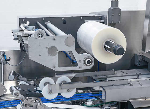 Máquina envolvedora Flow Pack horizontal (HFFS) que realiza tres soldaduras totalmente herméticas a prueba de filtraciones de líquidos para productos cárnicos y avícolas en bandeja. Específicamente diseñado para trabajar con films estirables retráctiles.