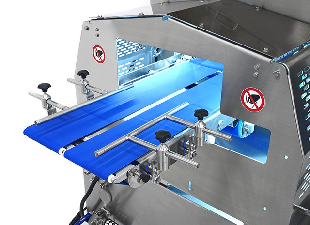 - Entrada de bandejas y posicionamiento: cintas accionadas por mototambor.