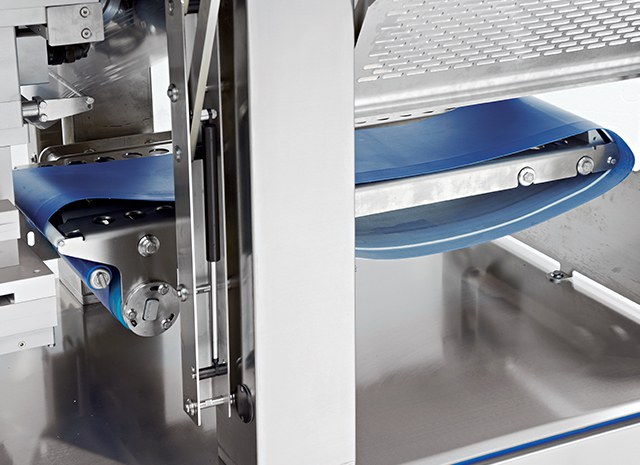 Entrada de bandejas y posicionamiento: cinta accionada por mototambor.