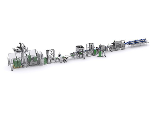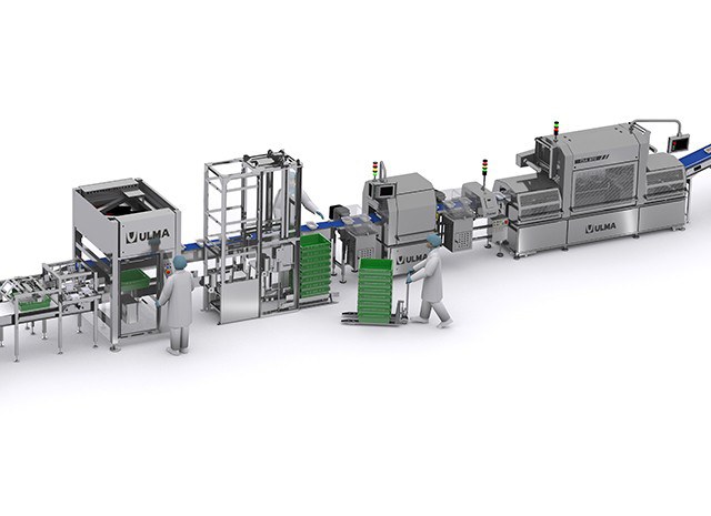 Línea completa de envasado totalmente automatizada para el envasado de pechugas de pollo en bandejas termoselladas.