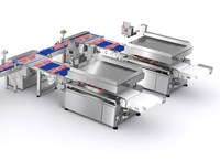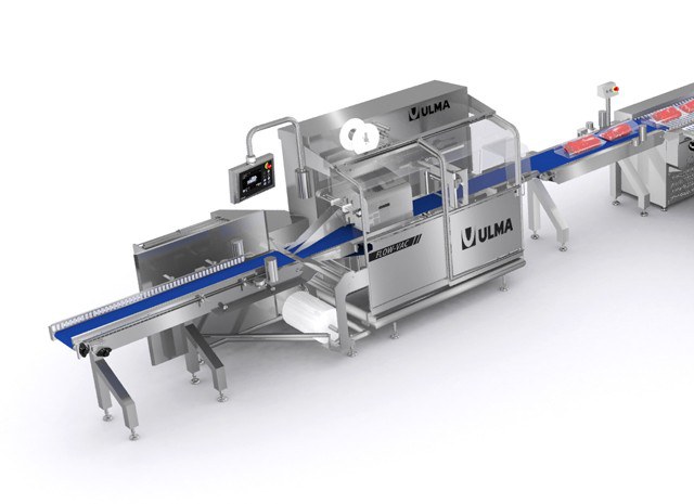 Solución de envasado automático al vacío de cortes industriales de carne con sistema de transfer doble a campanas de vacío.