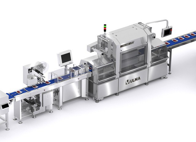 La termoselladora higienizable automática TSA de ULMA sella las bandejas de filetes de carne en una atmósfera controlada para aumentar su vida útil. Dispone de un desapilador automático de bandejas que va extrayendo las bandejas a la cinta de alimentación.