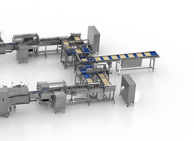 El sistema recibe los bloques de wafers desde el proceso. En función del formato de envasado. El sistema puede distribuir el producto a una máquina o a dos. Además está preparada para que en caso de parada de máquina, el producto se pueda desviar a la máquina que no está trabajando.