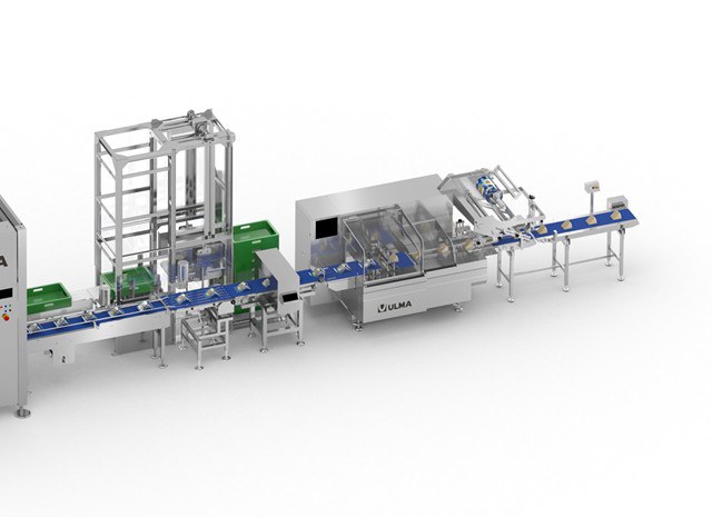 La línea cuenta con un desapilador automático de cajas vacías para alimentar la célula robotizada de encajado.